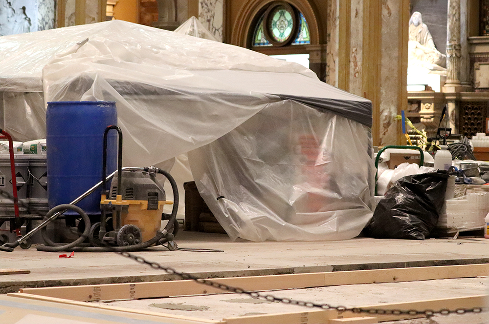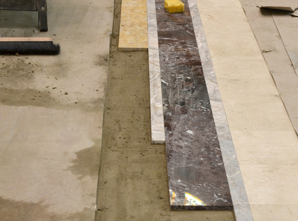 Once the first section of pews was removed in January of 2023 (the photo above shows the front of the Shrine without the pews), work on the flooring underneath began. Whole sections were carved out so that new, precisely cut marble tiles could be installed. The concrete areas under the pews were also replaced.