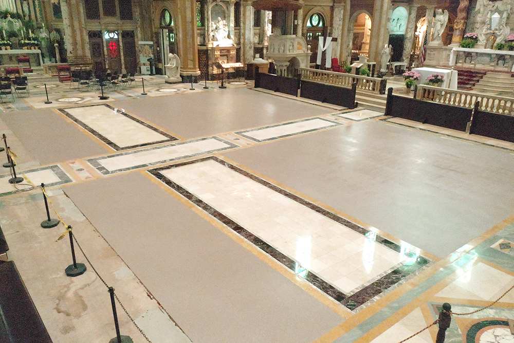 It may be true that not too many visitors to the Basilica look down. With so many wondrous works of art at eyeline or higher ... statues, paintings, sculptures ... it can be easy to overlook the floor. As expected, age and weather have not been kind to the Shrine's floors. Cracks, divots, and holes large enough to gather standing water have become increasingly dangerous for visitors to navigate.
